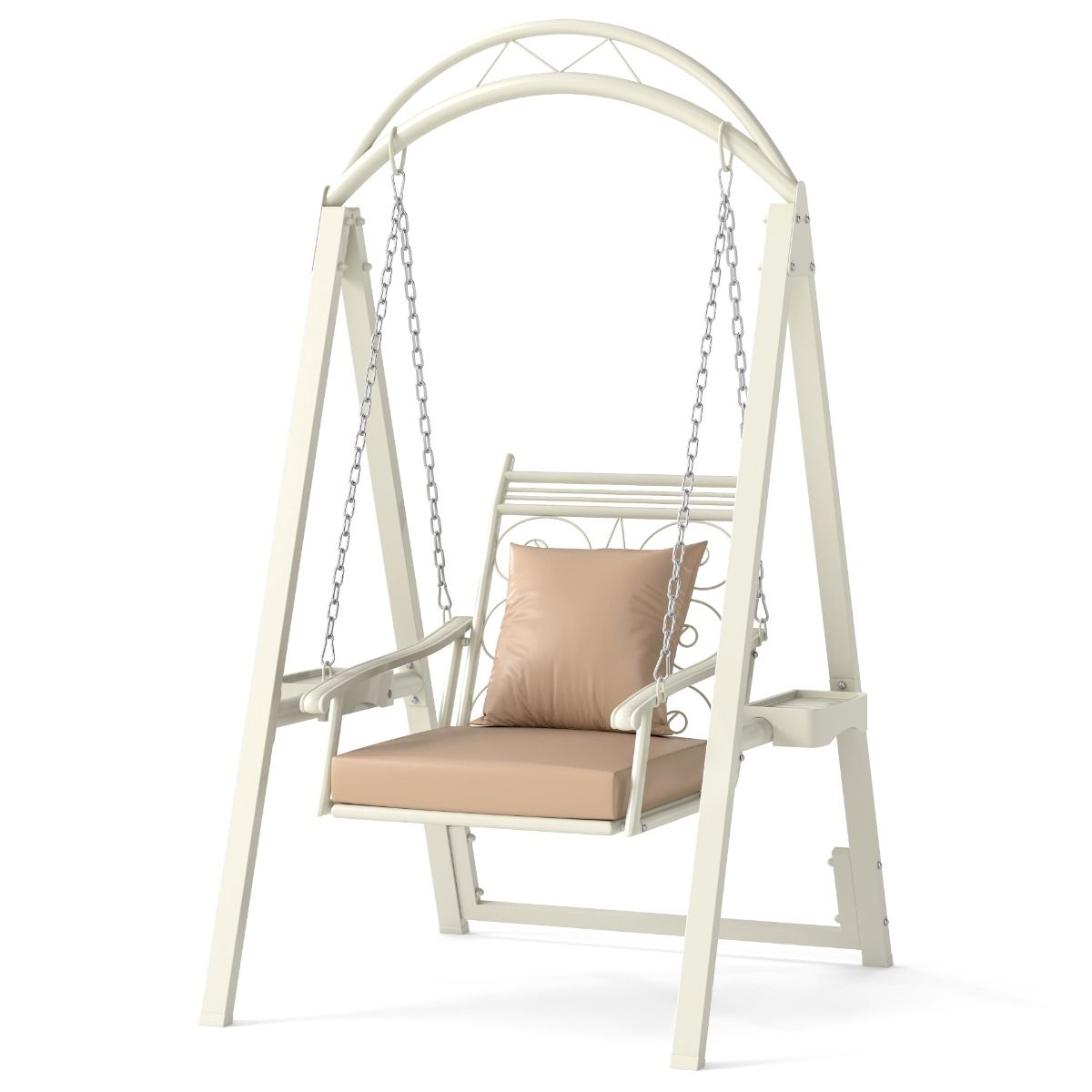 Praktično udobje: Vgrajene stranske mizice na tej vrtni gugalnici zagotavljajo prostor za pijačo, prigrizke ali knjige - vse to je med nežnim guganjem na dosegu roke.