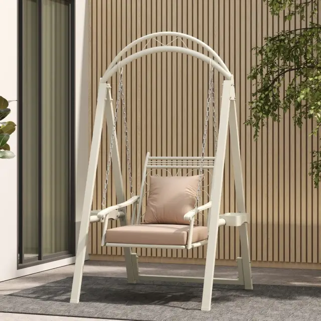 Uživajte v sproščujočih trenutkih z našo vrtno gugalnico. Ta vrtna gugalnica ima eleganten, ukrivljen strešni okvir in vzorce v obliki listov, ki se harmonično ujemajo z oblikovanjem vsakega vrta, balkona ali terase. Zahvaljujoč robustnemu kovinskemu okvirju z ojačano prečko ima gugalnik visoko nosilnost do 160 kg. Višinsko nastavljive verige z varnostnimi karabini zagotavljajo individualno udobje. Mehke, odstranljive blazine s peno visoke gostote zagotavljajo dodatno udobje pri sedenju. Vgrajene stranske mizice omogočajo, da imate pijačo ali prigrizke na dosegu roke, ne da bi morali vstati.