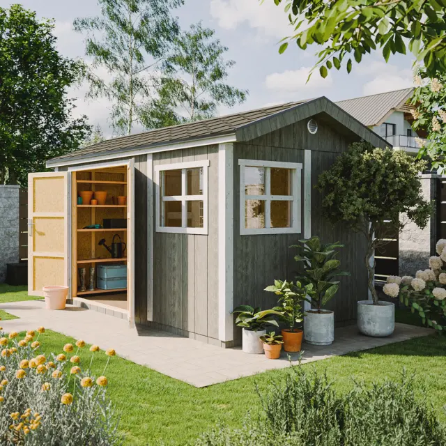 Vrtna hišica vrhunske kakovosti 8,68 m² - V252x250x412 cm - s tlemi in bitumenskimi ploščicami - TIMBELA M914A-REDWOOD RED