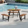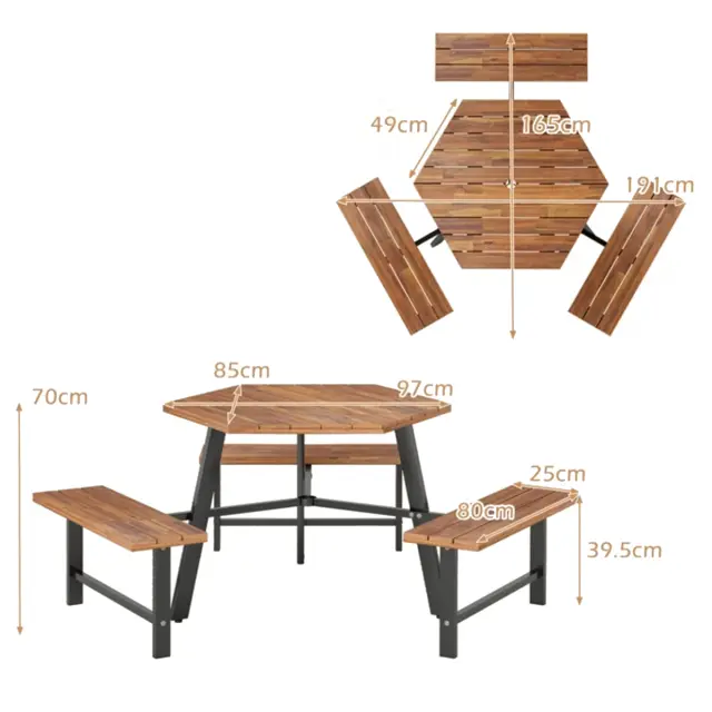 Visokokakovosten akacijev les: Površina klopi in mizna plošča sta izdelani iz visokokakovostnega akacijevega lesa, ki je znan po svoji trpežnosti in trdnosti. Poleg tega je lesena površina obdelana s plastjo zaščitnega olja, ki poudari njeno naravno lepoto in podaljša življenjsko dobo.