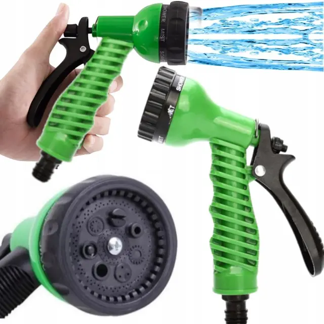 Večnamenska škropilna pištola, pištola ima kar 7 škropilnih funkcij , zaradi česar jo enostavno prilagodite dani situaciji – zalivanje rož, škropljenje vrta ali pranje avtomobila.