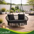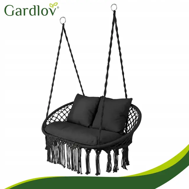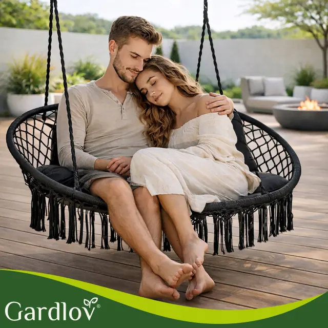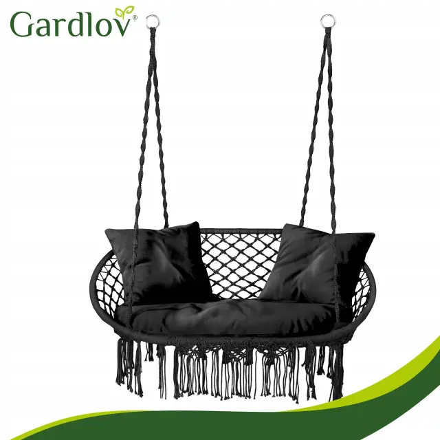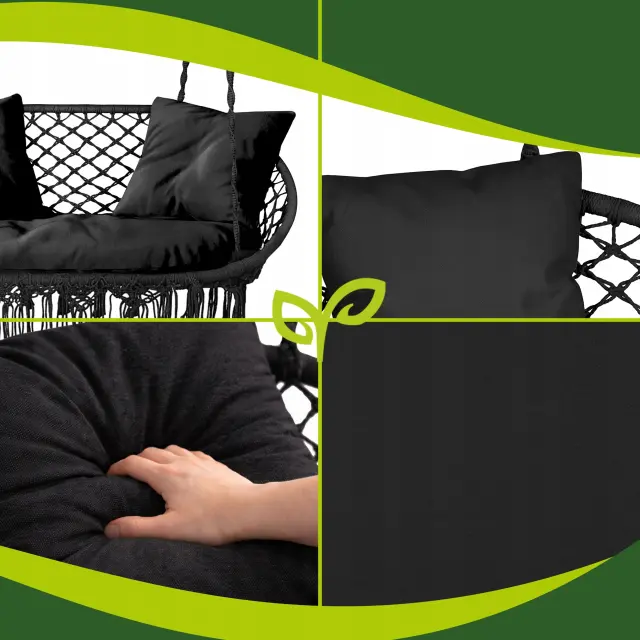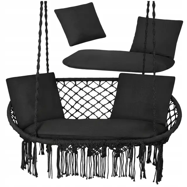 Uživajte v dvojni sprostitvi! Ta prostorna viseča gugalnica v elegantni črni barvi je zasnovana za tiste, ki si želijo več prostora in maksimalno udobje. Z XXL gugalnico, ki je dovolj široka za dve osebi, in mehko oblazinjenimi blazinami, postane ta gugalnica takojšnji center pozornosti na vašem vrtu, terasi ali v večji dnevni sobi. Robustna jeklena konstrukcija zagotavlja brezskrbno zibanje, medtem ko pletenje iz trpežnega tehnoratana prinaša pridih naravnega videza z izjemno odpornostjo na vremenske vplive.