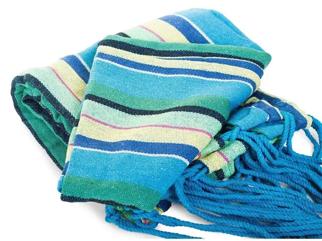 Ta elegantna in robustna mreža ponuja popolno kombinacijo udobja, stila in vzdržljivosti, kar jo naredi idealno izbiro za vsak vrt, teraso, dvorišče ali notranji prostor. Narejena je iz visokokakovostnega bombaža in poliestra, ki zagotavljata mehkobo in trpežnost, medtem ko barvit vzorec Rainbow v modri odtenki dodaja eleganten pridih vašemu zunanjemu ali notranjemu okolju.