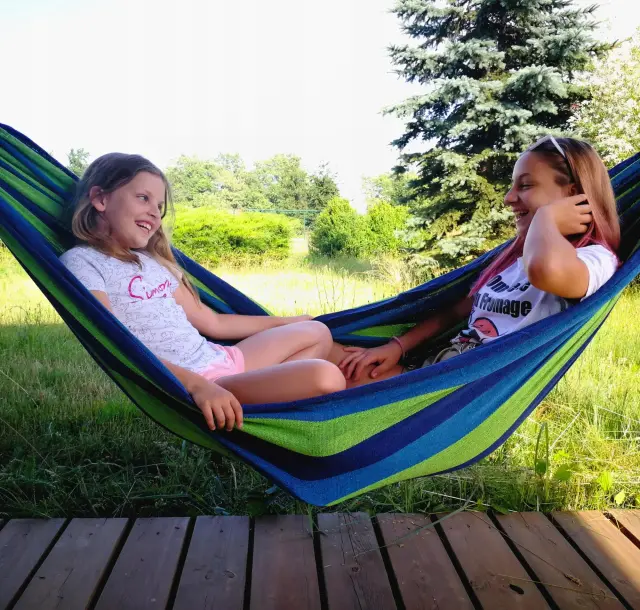 NARAVNI MATERIAL – viseča mreža je izdelana iz bombaža z majhno količino poliestra, zaradi česar je prijetna na dotik in trpežna. Poleg tega zagotavlja tudi ustrezno zračenje, kar zagotavlja veliko udobje pri uporabi v vročih dneh. Material lahko enostavno operete v pralnem stroju.