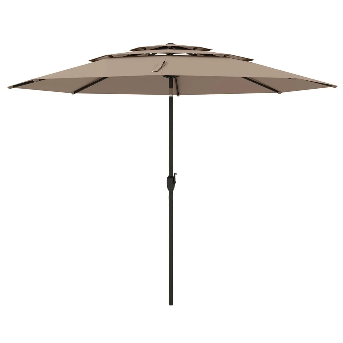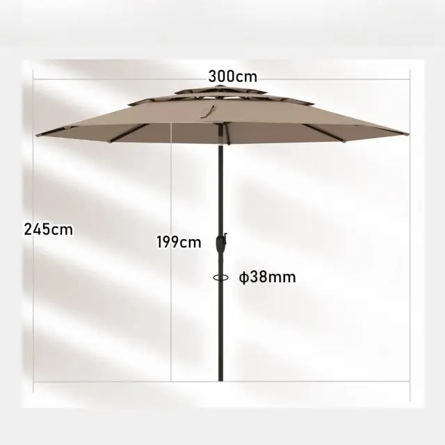 Tristopenjski prezračevani zgornji del našega senčnika za teraso omogoča lažje dviganje in uhajanje toplote ter zagotavlja hladno senco. Sončnik dolžine 300 cm je opremljen z mehanizmom za nagibanje, tako da lahko preprosto nastavite kot. Izdelan je iz poliestrske tkanine, ki je trpežna, barvno obstojna in odporna na kapljanje. Konstrukcija je ojačana z 38 mm kovinskim drogom in 8 močnimi prečkami. Opremljen je z ročajem, ki omogoča enostavno odpiranje in zapiranje. Zasnovan je za enostavno shranjevanje in sestavljen iz odstranljivih stebričkov v 2 delih.
