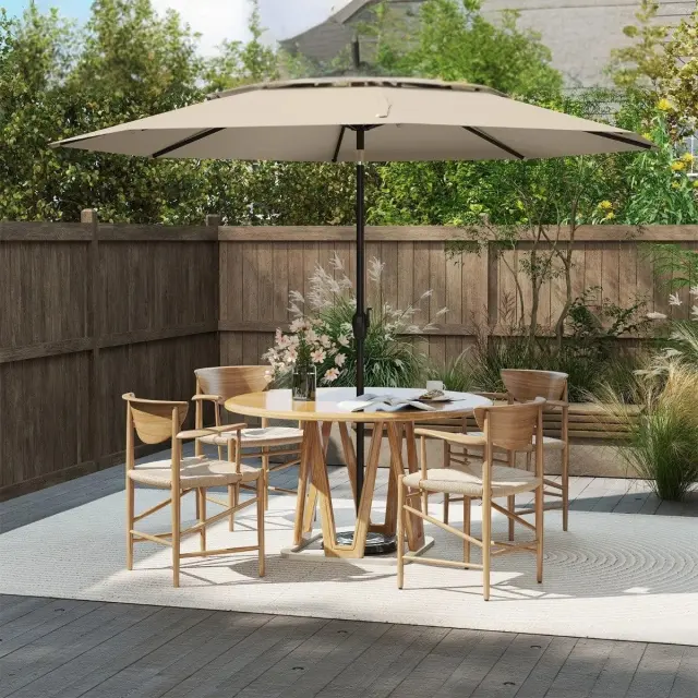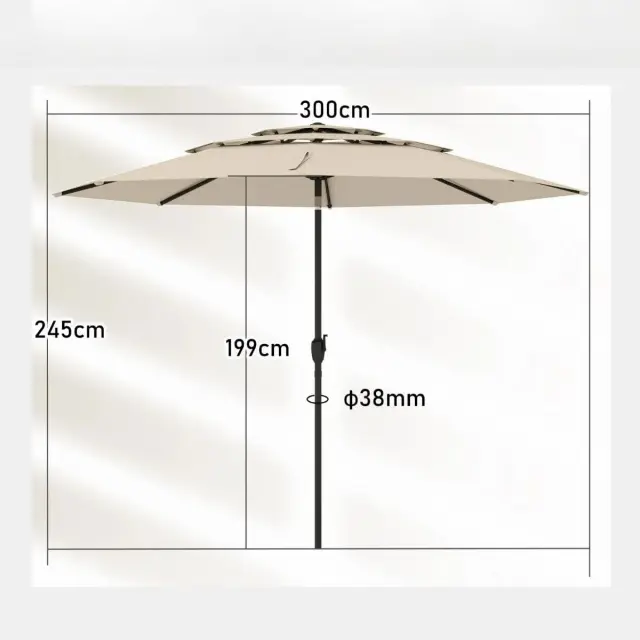 Trislojni prezračevani zgornji del senčnika za teraso omogoča, da se toplota lažje dviga in odhaja, pod njim pa je hladnejši prostor v senci. Poleg tega je 300-centimetrski senčnik opremljen z mehanizmom za nagibanje, ki vam omogoča enostavno nastavitev kota strehe senčnika. Senčnik je izdelan iz poliestrske tkanine, ki ni le trpežna in obstojna na svetlobi, temveč je tudi odporna na mlako. Struktura vrtnega senčnika je ojačana z 38 mm debelim kovinskim drogom in 8 robustnimi nosilci za senčnik. Velik zunanji senčnik lahko preprosto odprete in zaprete z ročico. Zasnovan je za enostavno shranjevanje in vzdrževanje ter je sestavljen iz 2 snemljivih drogov. Priložen je tudi trak za pritrditev, s katerim lahko pritrdite zložen senčnik.