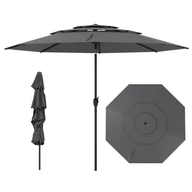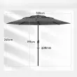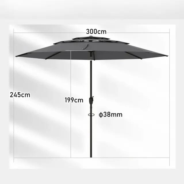 Trislojni prezračevani zgornji del senčnika za teraso omogoča, da se toplota lažje dviga in odhaja, pod njim pa je hladnejši prostor v senci. Poleg tega je 300-centimetrski senčnik opremljen z mehanizmom za nagibanje, ki vam omogoča enostavno nastavitev kota strehe senčnika. Senčnik je izdelan iz poliestrske tkanine, ki ni le trpežna in obstojna na svetlobi, temveč je tudi odporna na mlako. Struktura vrtnega senčnika je ojačana z 38 mm debelim kovinskim drogom in 8 robustnimi nosilci za senčnik. Velik zunanji senčnik lahko preprosto odprete in zaprete z ročico. Zasnovan je za enostavno shranjevanje in vzdrževanje ter je sestavljen iz 2 snemljivih drogov. Priložen je tudi trak za pritrditev, s katerim lahko pritrdite zložen senčnik.