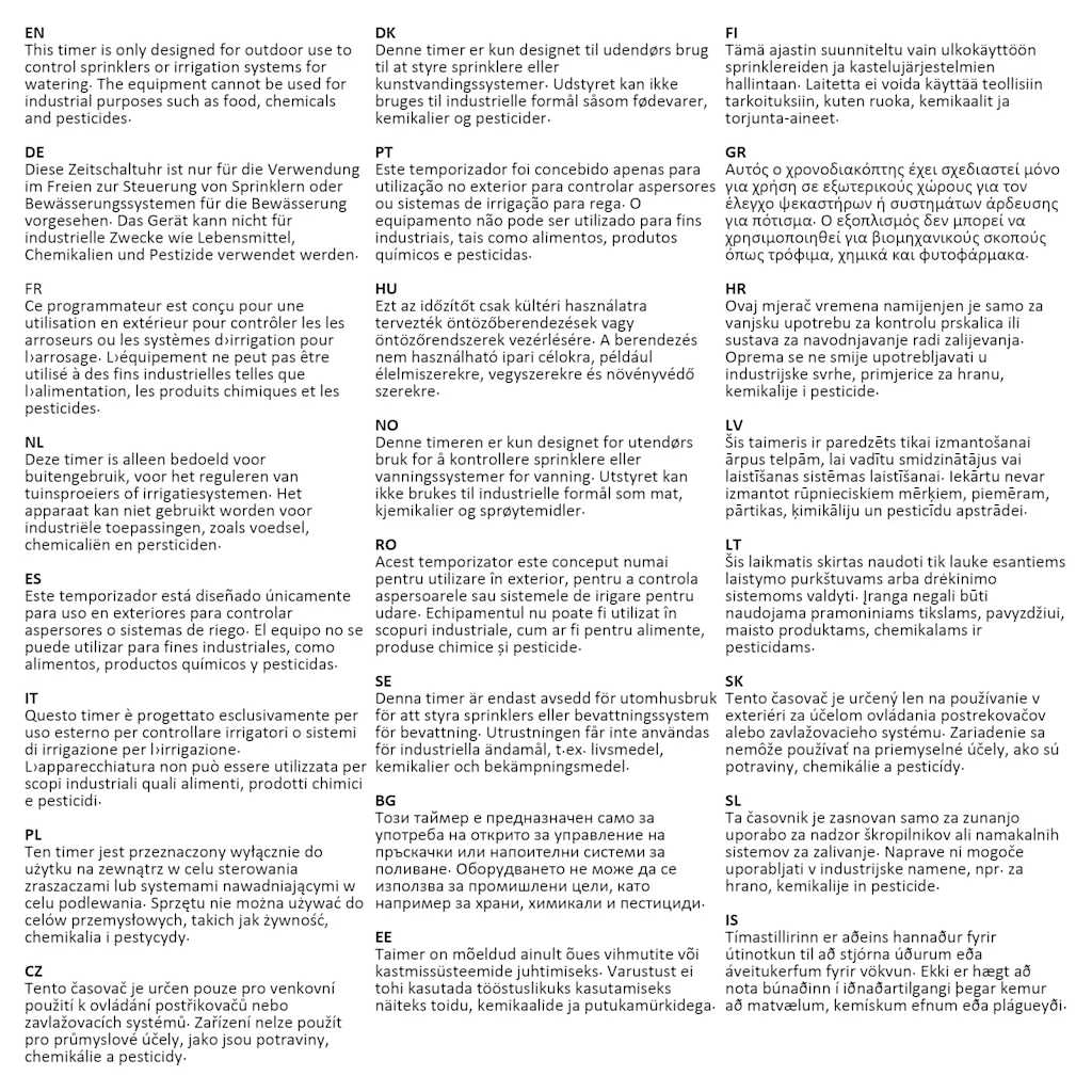 Ta časovnik je zasnovan samo za zunanjo uporabo za nadzor škropilnikov ali namakalnih sistemov za zalivanje. Naprave ni mogoče uporabljati v industrijske namene, npr. za hrano, kemikalije in pesticide.
