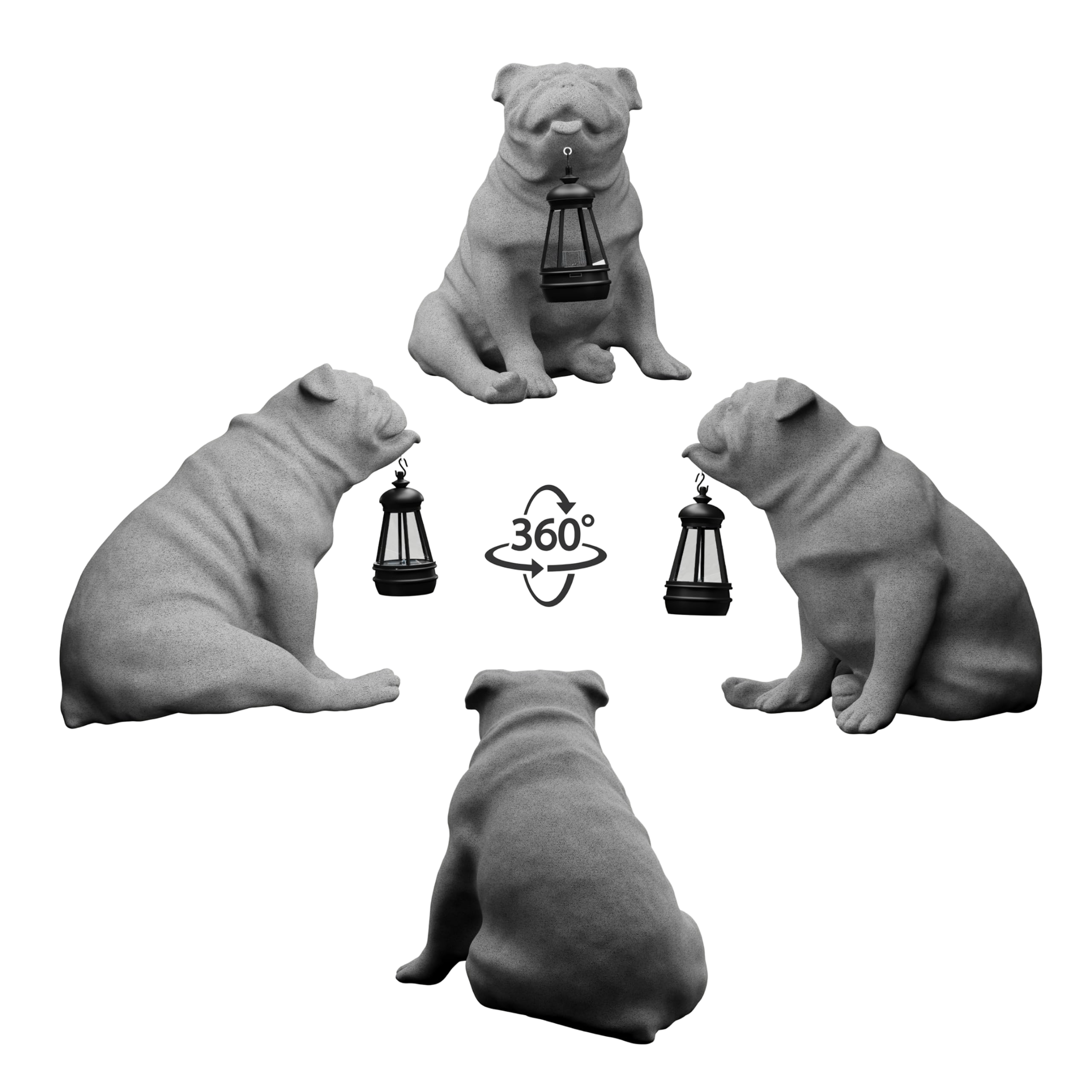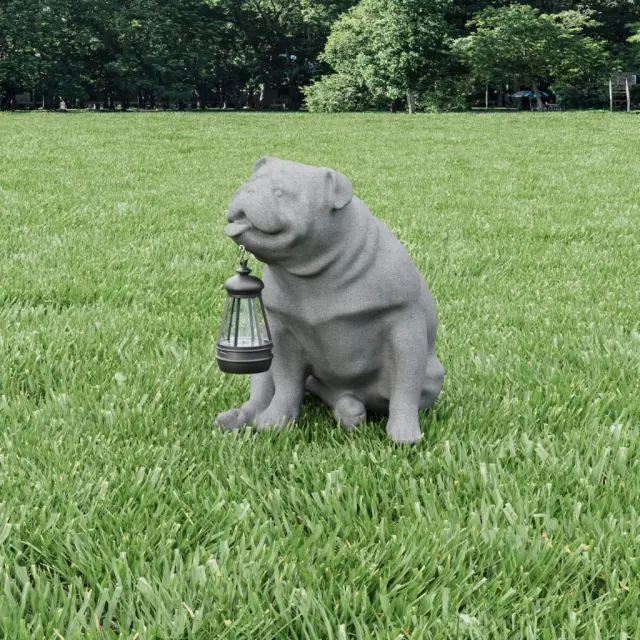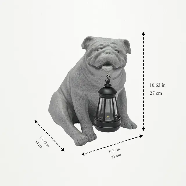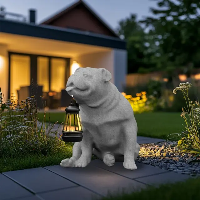 Vrtni kip v obliki buldoga je premišljeno zasnovan dekorativni element, ki združuje realističen videz s funkcionalno zunanjo osvetlitvijo. Skulptura v gobcu drži elegantno svetilko z energetsko varčnimi LED diodami, ki po sončnem zahodu oddajajo toplo svetlobo in ustvarijo prijeten ambient. Izdelek je primeren za postavitev na različne zunanje površine, kot so terase, balkoni ali vrtne poti, kjer služi kot estetski dodatek in praktična orientacijska luč. Zaradi kakovostne izdelave figurica ohranja svojo obliko in barvo skozi vse letne čase, hkrati pa ponuja okolju prijazno rešitev brez potrebe po električnih kablih.