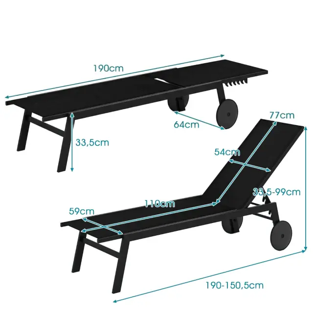 Nezahtevna mobilnost: Ta ležalnik na prostem je opremljen z dvema vgrajenima kolescema, ki omogočata gladko in nekomplicirano premikanje po različnih površinah. Kolesca so nedrseča in odporna proti obrabi, kar zagotavlja varnost in vzdržljivost.