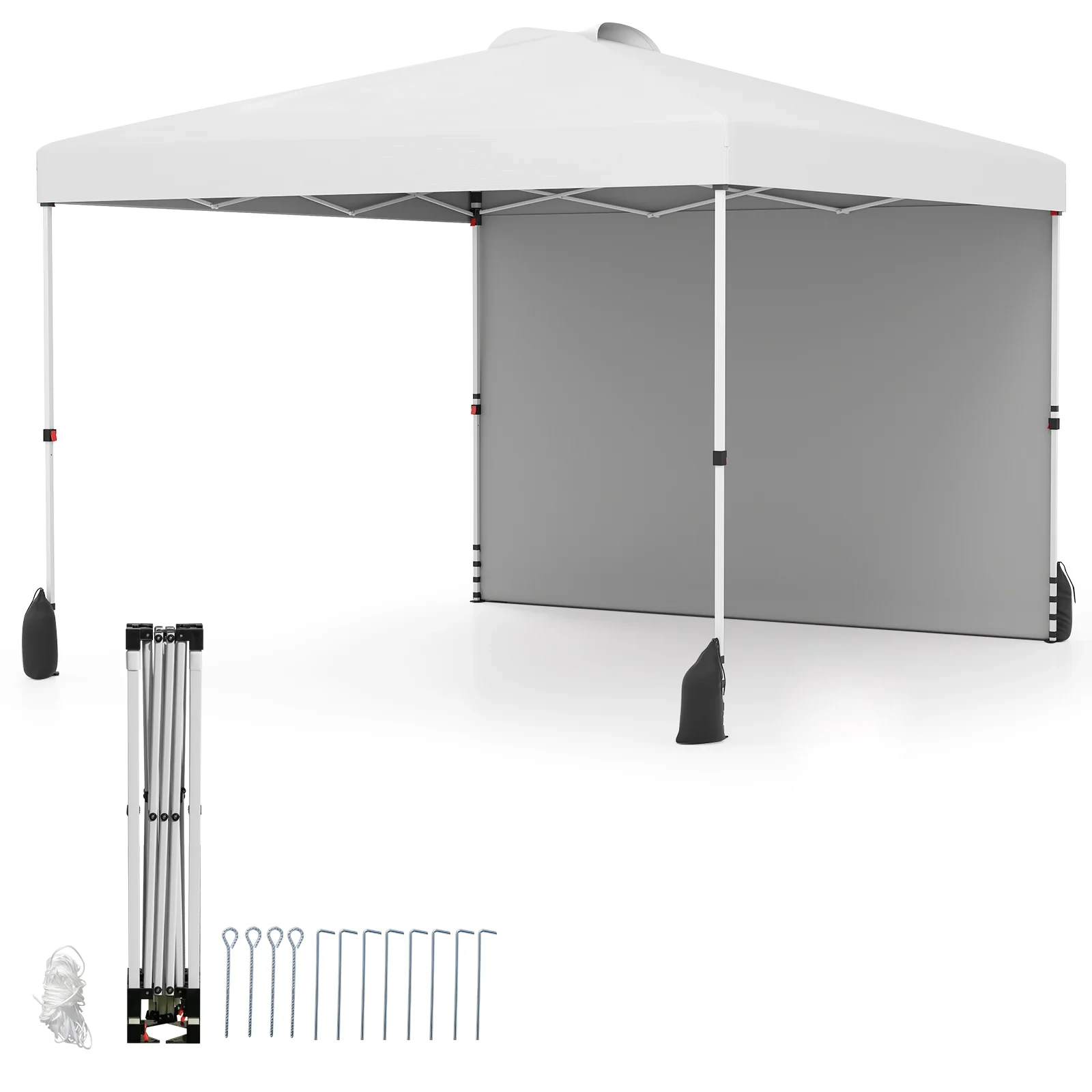 Naš pop-up gazebo meri 3 x 3 x 2,66-2,86 M (D x Š x V) in je opremljen s 3-stopenjskim mehanizmom za nastavitev višine ter odstranljivimi stranskimi stenami, ki jih je mogoče prilagoditi. Inovativno izskočno zasnovo lahko hitro in brez orodja postavite, ko je ne uporabljate, pa jo lahko preprosto zložite in shranite v prenosno zložljivo torbo za enostaven prevoz. Za dodatno zaščito pred vetrom je gazebo opremljen z 8 kovinskimi kavlji, 4 kovinskimi sidri, 4 vrvmi za zaščito pred vetrom in 4 vrečami s peskom, ki zagotavljajo varen in zanesljiv zunanji prostor. Poleg tega je gazebo izdelan iz visokokakovostne tkanine Oxford s srebrnim premazom za prvovrstno zaščito pred soncem in dežjem ter trpežnost (opomba: izogibajte se uporabi ob močnem dežju ali močnem vetru).