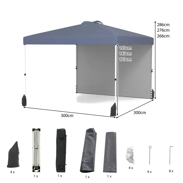Naš pop-up gazebo meri 3 x 3 x 2,66-2,86 M (D x Š x V) in je opremljen s 3-stopenjskim mehanizmom za nastavitev višine ter odstranljivimi stranskimi stenami, ki jih je mogoče prilagoditi. Inovativno izskočno zasnovo lahko hitro in brez orodja postavite, ko je ne uporabljate, pa jo lahko preprosto zložite in shranite v prenosno zložljivo torbo za enostaven prevoz. Za dodatno zaščito pred vetrom je gazebo opremljen z 8 kovinskimi kavlji, 4 kovinskimi sidri, 4 vrvmi za zaščito pred vetrom in 4 vrečami s peskom, ki zagotavljajo varen in zanesljiv zunanji prostor. Poleg tega je gazebo izdelan iz visokokakovostne tkanine Oxford s srebrnim premazom za prvovrstno zaščito pred soncem in dežjem ter trpežnost (opomba: izogibajte se uporabi ob močnem dežju ali močnem vetru).