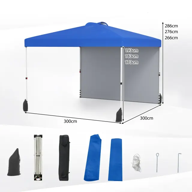 Naš pop-up gazebo meri 3 x 3 x 2,66-2,86 M (D x Š x V) in je opremljen s 3-stopenjskim mehanizmom za nastavitev višine ter odstranljivimi stranskimi stenami, ki jih je mogoče prilagoditi. Inovativno izskočno zasnovo lahko hitro in brez orodja postavite, ko je ne uporabljate, pa jo lahko preprosto zložite in shranite v prenosno zložljivo torbo za enostaven prevoz. Za dodatno zaščito pred vetrom je gazebo opremljen z 8 kovinskimi kavlji, 4 kovinskimi sidri, 4 vrvmi za zaščito pred vetrom in 4 vrečami s peskom, ki zagotavljajo varen in zanesljiv zunanji prostor. Poleg tega je gazebo izdelan iz visokokakovostne tkanine Oxford s srebrnim premazom za prvovrstno zaščito pred soncem in dežjem ter trpežnost (opomba: izogibajte se uporabi ob močnem dežju ali močnem vetru).