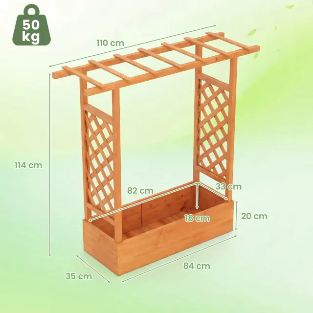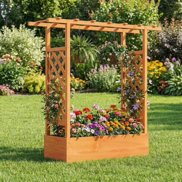 Ta dvignjena greda 2 v 1 združuje veliko posodo za sadike, visečo streho in rešetko, kar je idealno za podporo plezalkam, viseči trtici, bujni zelenjavi ali visečim košaram, hkrati pa je eleganten dekorativni element na vaši terasi ali vrtu.