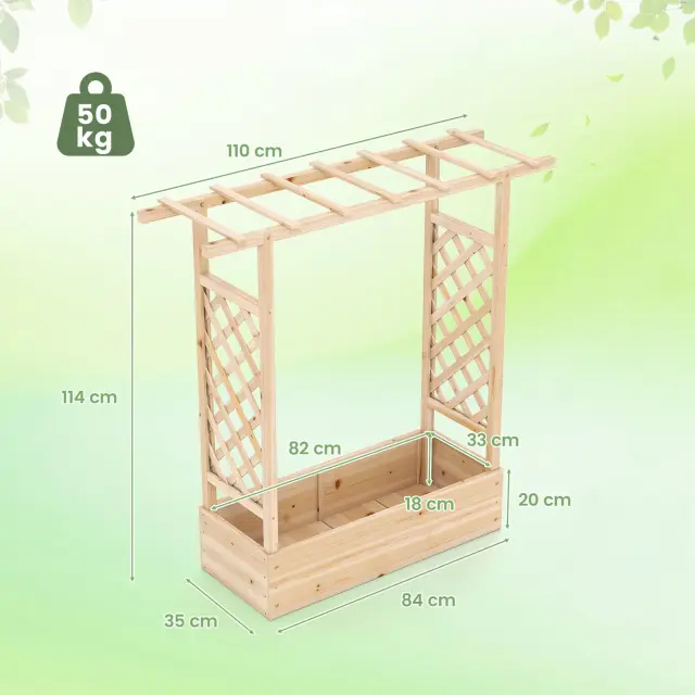 Ta dvignjena greda 2 v 1 združuje veliko posodo za sadike, visečo streho in rešetko, kar je idealno za podporo plezalkam, viseči trtici, bujni zelenjavi ali visečim košaram, hkrati pa je eleganten dekorativni element na vaši terasi ali vrtu.