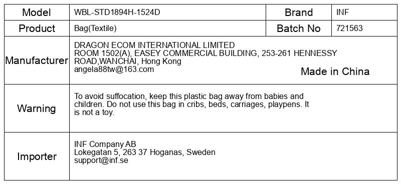 Da se izognete zadušitvi, hranite to plastično vrečko stran od dojenčkov in otrok. Te vrečke ne uporabljajte v zibelkah, posteljah, vozičkih, stajicah. To ni igrača.