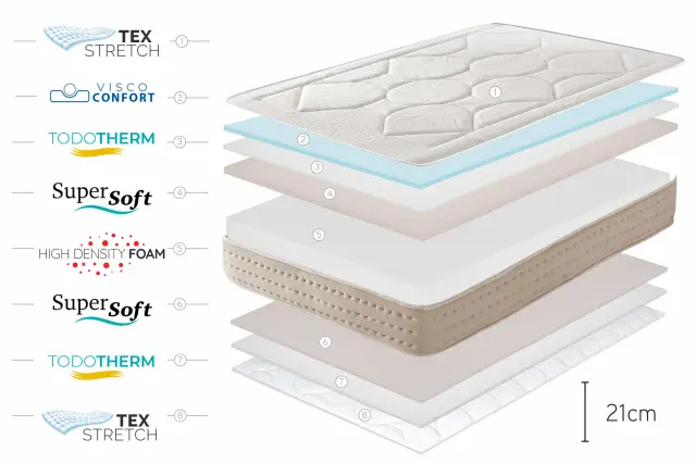 Vzmetnica Grand Memory ima viskoelastični material, ki je najnovejša generacija materiala, ki se uporablja v vrhunskih vzmetnicah. Je hiperprevoden in je sposoben odpraviti velike odmerke toplotnega toka ter tako doseči počitek brez kopičenja temperature.
