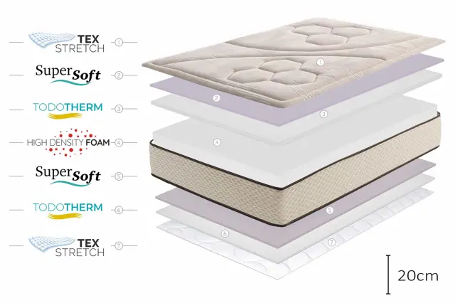 Vzmetnica ima 5 cm debel večplastni sistem sestavljen iz pene SuperSoft in Biotherm vlaken. Vse te komponente omogočajo, da vzmetnica nudi udoben počitek in se popolnoma prilagaja oblikam vašega telesa