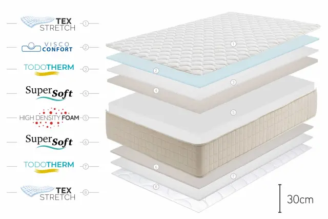 Sistem Pression Care: Ima več con in zato popolnoma porazdeli težo. Sestava te vzmetnice vključuje 6 cm debeline večplastnega sistema, sestavljenega iz spominske pene, ViscoSoft pene in BIOTHERM vlaken. Njegovim različnim slojem namenjenim udobju prispeva spominska pena in ViscoSoft pena, ki zagotavljata udobno prilagodljivost in visoko stopnjo udobja.