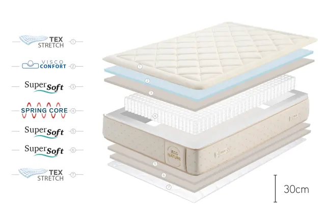 Eco Nature Spring ni le vzmetnica, ampak zaveza k počitku, dolgotrajnemu udobju in izbiri materialov, ki spoštujejo vaše telo. Zasnovano za tiste, ki razumejo, da se dober spanec začne z dobro izbiro.