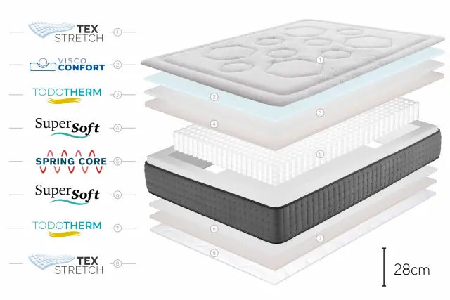 Vzmetnica ima tehnologijo Duo-System, ki zagotavlja dve neodvisni trdnosti na vsaki strani: Srednja trdnost na strani A in visoka trdnost na strani B.