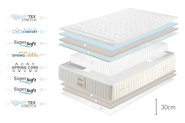 Sestava te vzmetnice vključuje 5 cm debel večplastni sistem, ki ga sestavljajo Viscoelastični material, pena ViscoSoft in vlakna Biotherm. Zaradi vseh teh sestavin ta vzmetnica zagotavlja udoben počitek in je popolnoma prilagojena obliki vašega telesa.