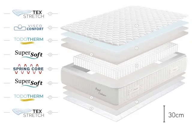 Vzmetnica Royal Exclusive z žepkastimi vzmetmi zagotavlja odlično udobje z odstranjevanjem pritisnih točk. Zahvaljujoč sistemu Pression Care in žepkastim vzmetnim ohišjem, vzmetnica doseže popolno prilagodljivost.