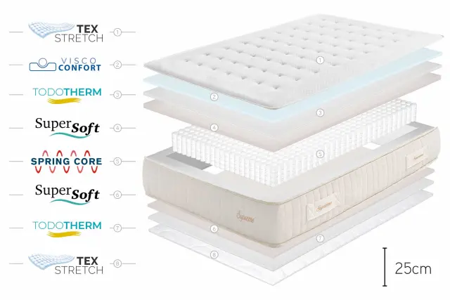 VISCOELASTIČNA VLAKNA: sistem udobja s 5 cm viskoelastičnih, Super Soft in Todotherm vlaken zagotavlja progresivno in postopno podporo. Ta sistem zagotavlja odlično prilagodljivost, ki uravnoteži in prilagodi vsako držo med spanjem.