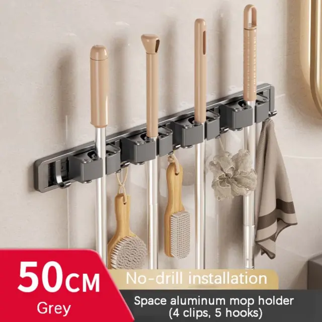 Prostorna shramba: Prosimo, upoštevajte: to niso originalni deli. Ta stenski nosilec za metle dolžine 50cm je zasnovan za maksimalno izrabo prostora v kuhinji, pralnici ali shrambi. Tanek profil širine 4.6cm in premične objemke omogočajo urejeno shranjevanje metel, mopov in orodij, medtem ko prilagodljive nastavitve omogočajo enostaven dostop in organizacijo predmetov različnih dimenzij. Idealno za majhne prostore in zasedene delovne prostore, kjer želite hitro in zanesljivo rešitev za obešanje in pripenjanje orodij.