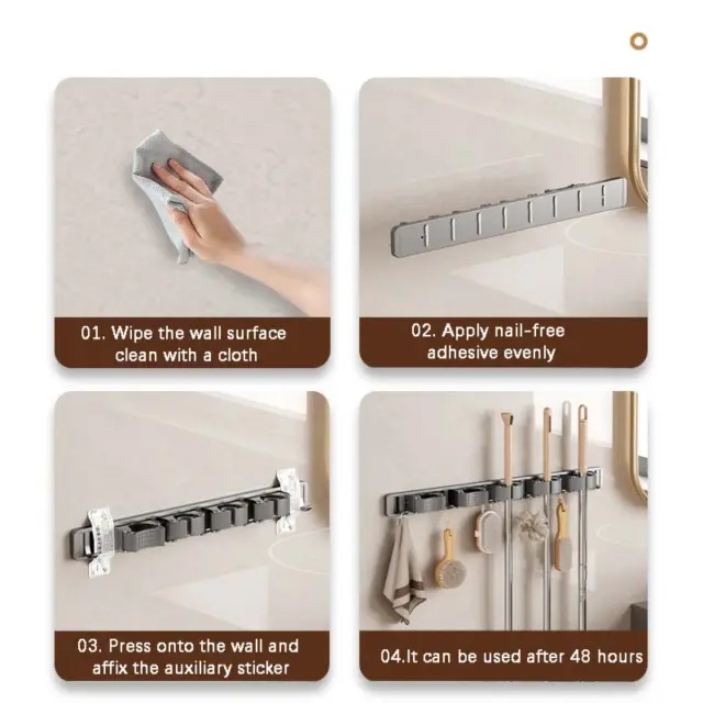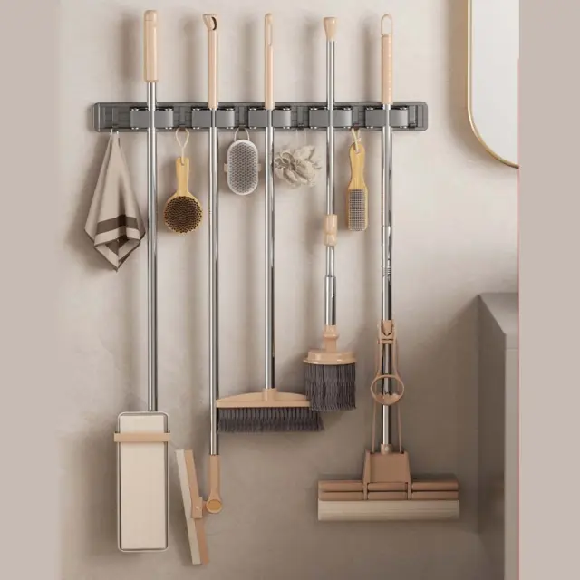 Prilagodljiv razpored: Prosimo, upoštevajte: to niso originalni deli. Premični objemki in kljuke omogočajo enostavno prilagoditev razmika levo ali desno, kar omogoča prilagajanje glede na velikost metel, mopov in drugih čistilnih pripomočkov. Ta prilagodljivost omogoča personalizirane kombinacije orodij, izboljša funkcionalnost shranjevanja in olajša reorganizacijo prostora brez dodatnih orodij. Primerno za stanovanjske in profesionalne scenarije, kjer se potrebe po shranjevanju pogosto spreminjajo.