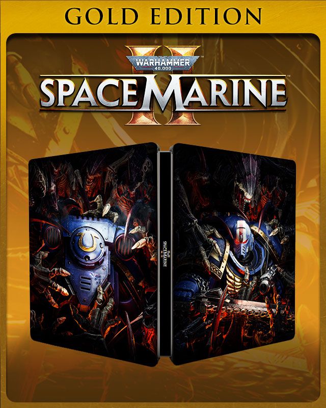 The Warhammer 40,000: Space Marine 2 Gold Edition vključuje osnovno igro Warhammer 40,000: Space Marine 2, sezonsko karto in ekskluzivno jekleno Steelbook® knjižico.