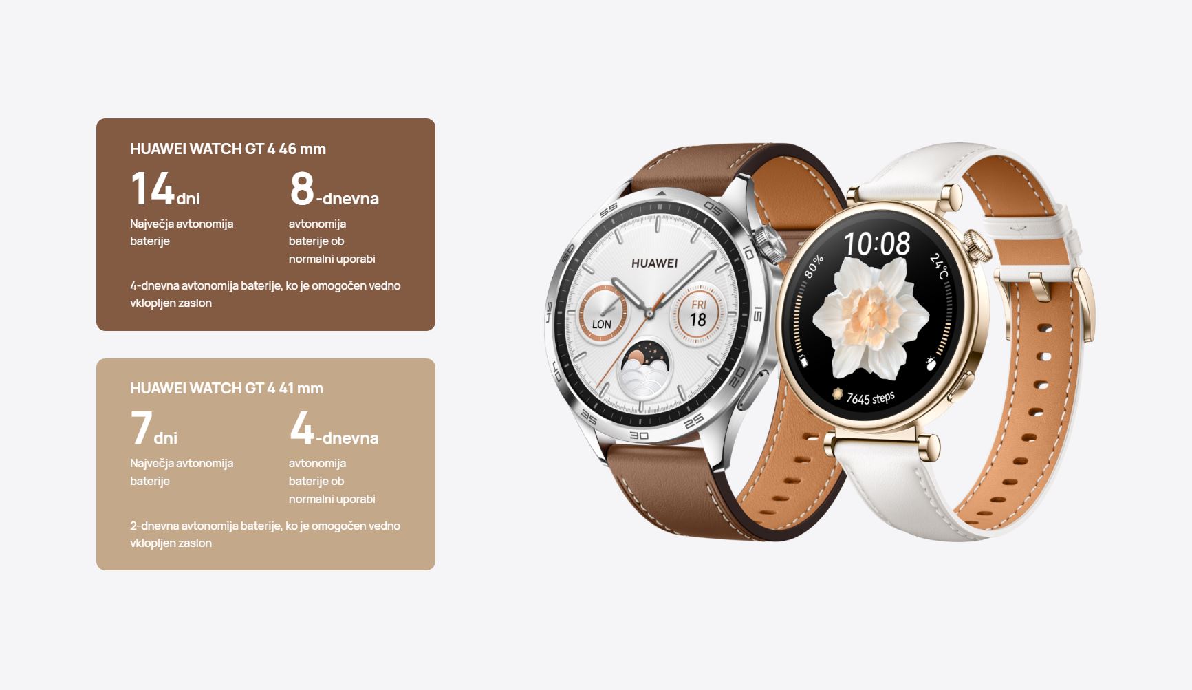 Avtonomija baterije: 7 dni avtonomije baterije ob najdaljši možni uporabi, 4 dni avtonomije baterije ob normalni uporabi, 2 dni avtonomije baterije z omogočenim vedno vklopljenim zaslonom