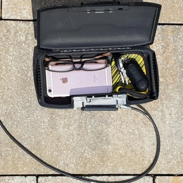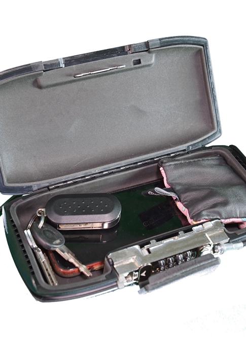 Vaš mobilnI sef... Vas ob odhodu v vodo vedno skrbi za ključe, telefon in denarnico? Prenosni sef lahko pritdite na kako večjo in težjo zadevo in morebitni nepridiprav se bo sigurno raje ukvarjal z denarnico, ki leži pod sosedovo brisačo. Ali pa sef namestite nekam pod avto in greste brez skrbi na sup/surf/kajt... Notranja mera 22 x 8,5 x 4cm, žica za pritrditev pa je dolga 60cm, da jo lahko napeljete tudi okrog manjšega drevesa... Štirimestna številčnica pa bo poskrbela, da nepridiprav ne bo prav hitro našel prave kombinacije. Dodaten pokrov tudi številčnico ščiti pred peskom in vodo...