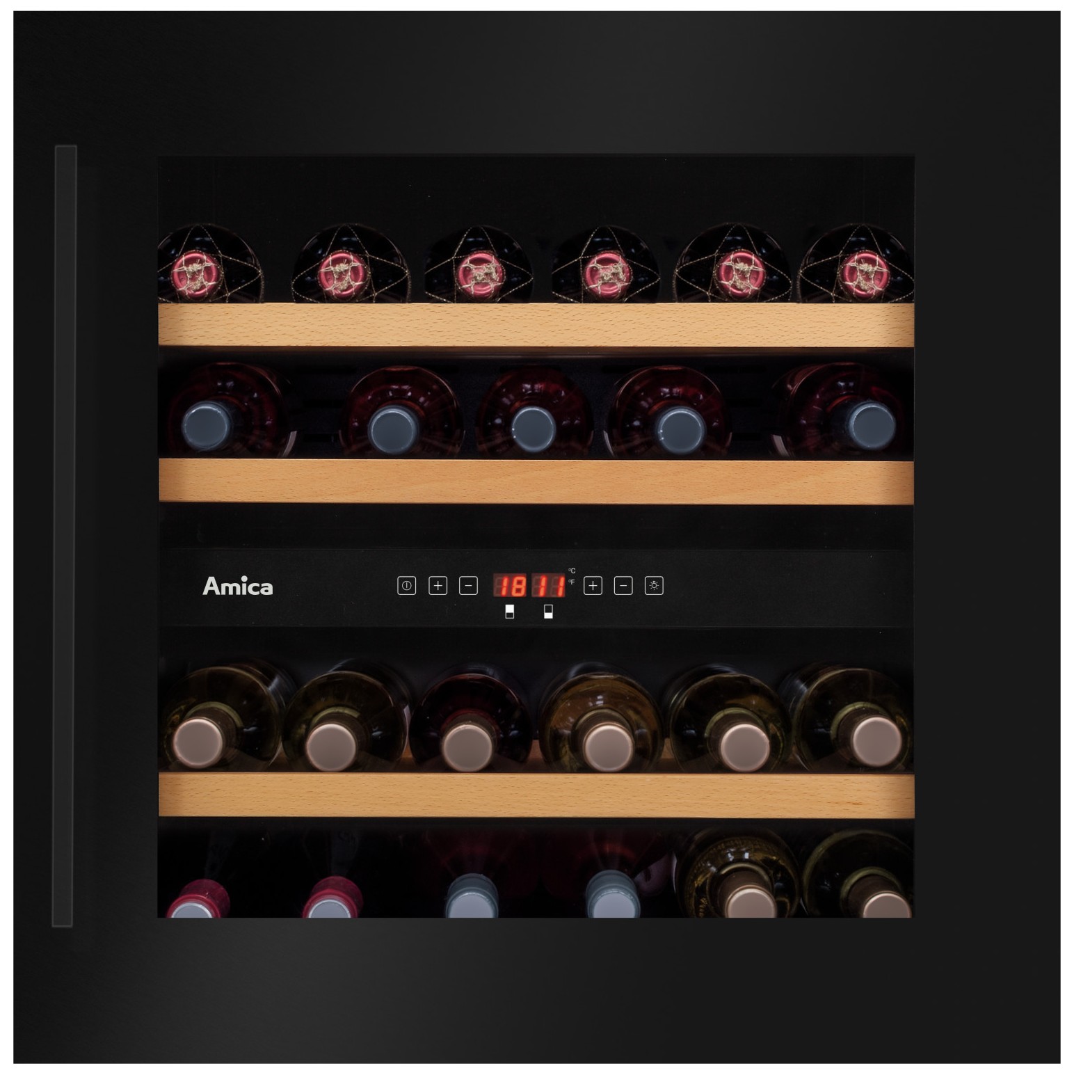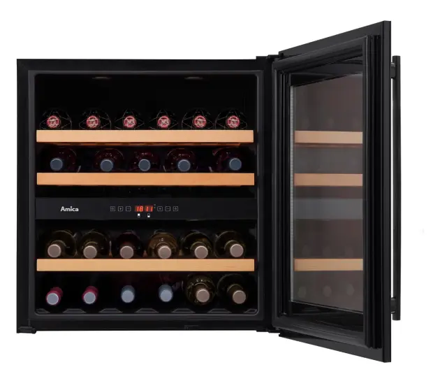 Dvoconska vgradna vinska vitrina Amica WCB2K60B36.1 vas bo navdušila s svojo veliko 75 litrsko prostornino, ki prinaša kapaciteto za shranjevanje 34 steklenic. Temperaturni razpon znaša od 5 do 20 C° v obeh conah, za primerno in popolnoma varno shranjevanje vaše najljubše vinske zbirke pa skrbijo elektronski nadzor temperature, zatemnjeno vratno steklo s filtrom za UV-žarke, optimalna vlažnost, ventilator za enakomerno in optimalno kroženje zraka, 3 lesene police, LED osvetlitev in alarm za prenizko temperaturo ter odprta vrata. Možnost zamenjave strani odpiranja vrat omogoča izjemno prilagodljivost, nadvse privlačen dizajn pa vsaki kuhinji doda pridih prefinjene elegance.