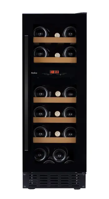 Vgradna dvoconska vinska vitrina Amica WCF2K30B16.1 se ponaša z 52 litrsko prostornino, ki omogoča hrambo 16 steklenic vina. Za vašo izbrano vinsko zbirko bodo poskrbeli elektronski nadzor temperature z razponom nastavitve od 5 do 20 °C, zatemnjeno vratno steklo s filtrom za UV žarke, optimalna vlažnost, ventilator za enakomerno in optimalno kroženje zraka, alarm za prenizko temperaturo in odprta vrata ter 5 lesenih polic. Vinska vitrina navdušuje tudi s svojo prijetno LED osvetlitvijo, tihim delovanjem in možnostjo zamenjave strani odpiranja vrat. Zasnovana je za skrbno in popolno hrambo vina, njen privlačen dizajn pa se prefinjeno prilega vsaki moderni kuhinji.