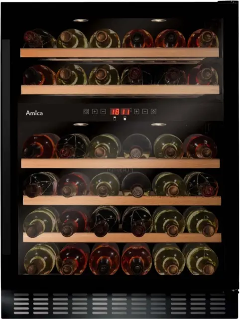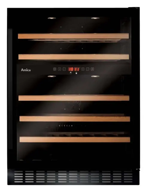 Vgradna vinska vitrina Amica WCU2K60B45.1 se pohvali z dvema ločenima conama, s skupno prostornino 125 litrov, s pomočjo katere lahko primerno hranite kar 45 steklenic. Za vašo najljubšo vinsko zbirko bodo poskrbeli elektronski nadzor temperature z razponom nastavitve od 5 do 20 °C v obeh conah, zatemnjeno vratno steklo s filtrom za UV žarke, optimalna vlažnost, ventilator za enakomerno in optimalno kroženje zraka, alarm za prenizko temperaturo in odprta vrata ter 5 lesenih polic. Vinska vitrina navdušuje tudi s svojo prijetno LED osvetlitvijo, tihim delovanjem in možnostjo zamenjave strani odpiranja vrat. Zasnovana je za skrbno in popolno hrambo vina, njen privlačen dizajn pa se prefinjeno prilega vsaki moderni kuhinji.