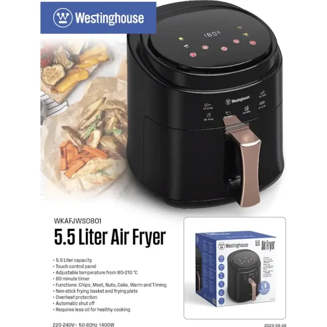 Si želite brez slabe vesti uživati v hrustljavih prigrizkih? Westinghouse cvrtnik na vroč zrak je prava rešitev za zdravo cvrtje. S tem 5,5-litrskim cvrtnikom na vroč zrak lahko uživate v okusnih jedeh brez olja. Uživajte v bolj zdravem življenjskem slogu in hkrati uživajte v svojih najljubših prigrizkih. Zakaj bi izbrali cvrtnik, ko pa lahko dosežete enak okus in teksturo s cvrtnikom Westinghouse?
