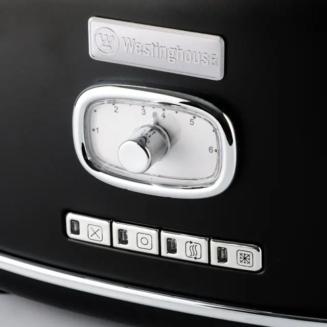 Westinghouse Retro Black 2 Slice opekač kruha ima sistem samodejnega centriranja, ki ohranja kruh na sredini za enakomerno popečenje na obeh straneh.