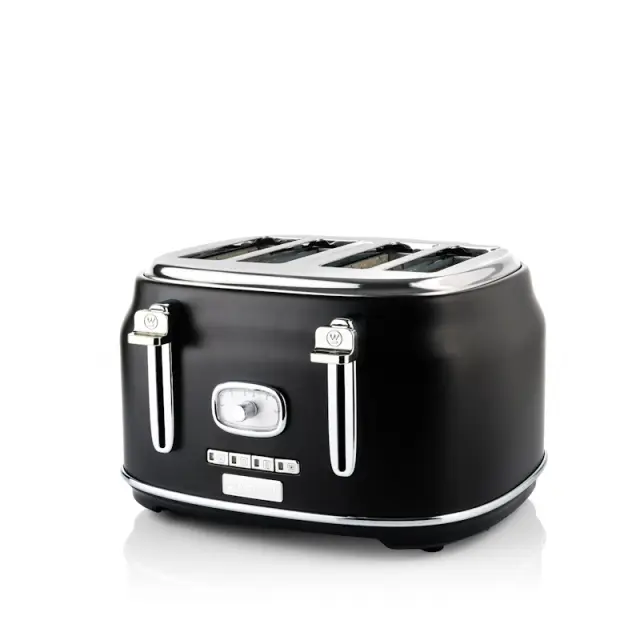 Westinghouse Retro Black 4 Slice opekač kruha ima sistem samodejnega centriranja, ki ohranja kruh v sredini za enakomerno popečenje na obeh straneh.