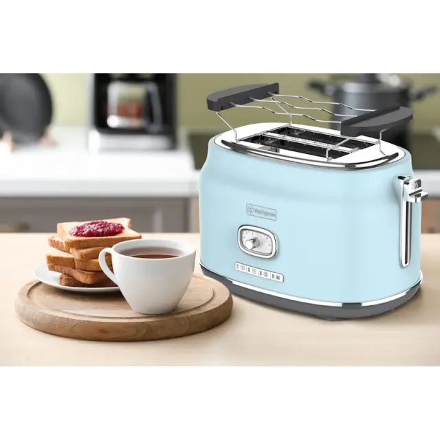 Westinghouse Retro Blue 2 Slice opekač kruha ima sistem samodejnega centriranja, ki ohranja kruh na sredini za enakomerno popečenje na obeh straneh.