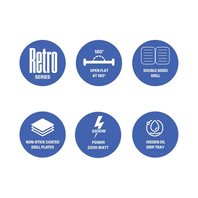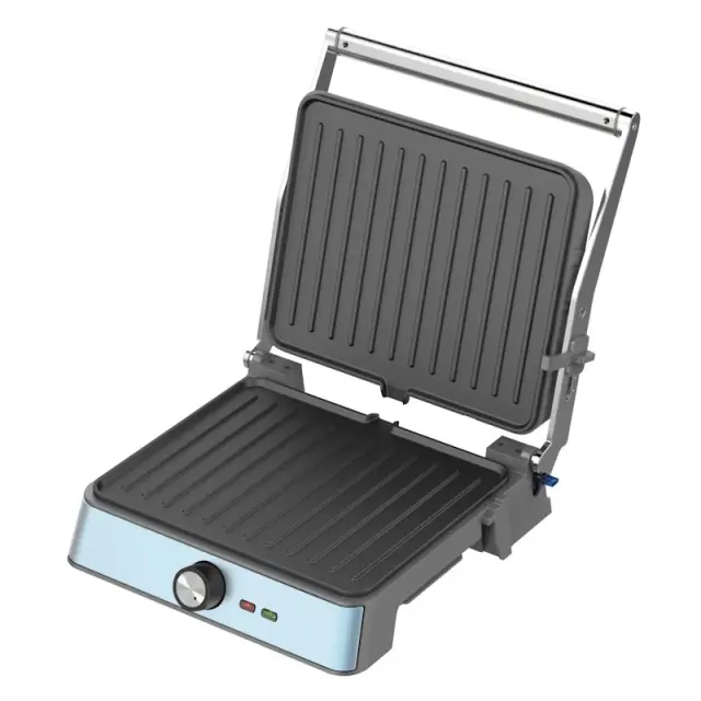 Nastavljiva temperatura, Pladenj za odvečno maščobo, Kontrolna lučka, Valovita površina, Toplotno izoliran ročaj, Nastavljiva višina