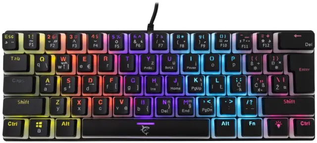 Število tipk: 61 Razporeditev tipk: Kompaktna Vrsta stikala: Mehansko - modra Življenjska doba: 20 M pritiskov Anti-Ghosting: Da / 21 tipk Osvetlitev ozadja: Mavrični učinek / 12 različnih učinkov Barva: Črna Material: Plastika Vmesnik: USB 2.0 Dodatne noge za tipkovnico dvig: Ne Dolžina kabla (m): 1,5 Pleten kabel: N Razpoložljive postavitve: HR Mere (mm): 290x100x39 Teža (g): 400