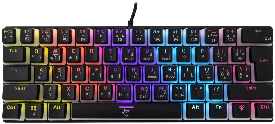 Število tipk: 61 Razpored tipk: Kompaktno Vrsta stikala: Mehansko - Rdeče Anti-Ghosting: Da / 21 tipk Osvetlitev ozadja: Mavrični učinek / 12 različnih učinkov Barva: Črna Material: Plastika Vmesnik: USB 2.0 Dodatne noge za dvig tipkovnice: Brez kabla dolžina (m): 1,5 Pleten kabel: N Razpoložljive postavitve: HR Mere (mm): 290x100x39 Teža (g): 400