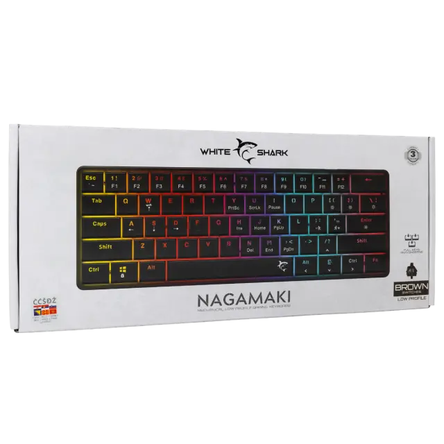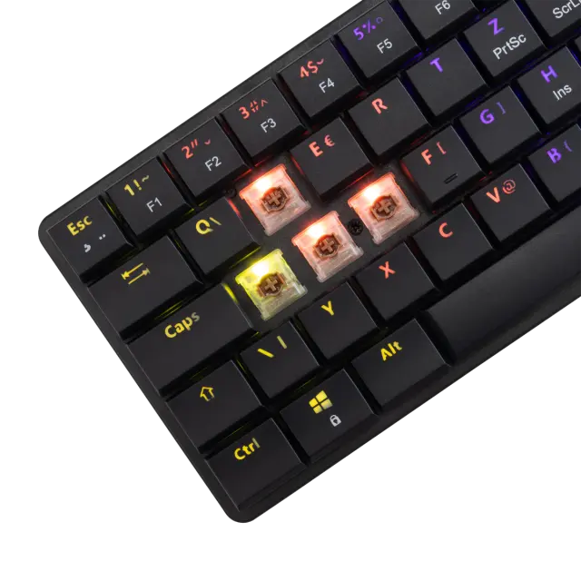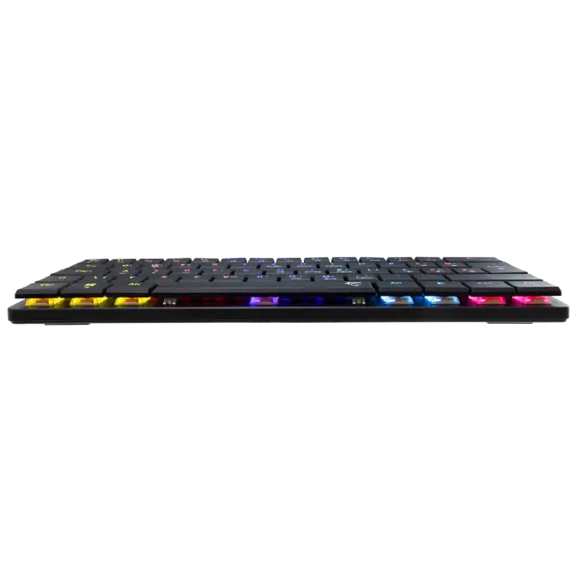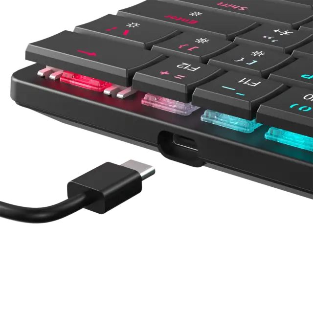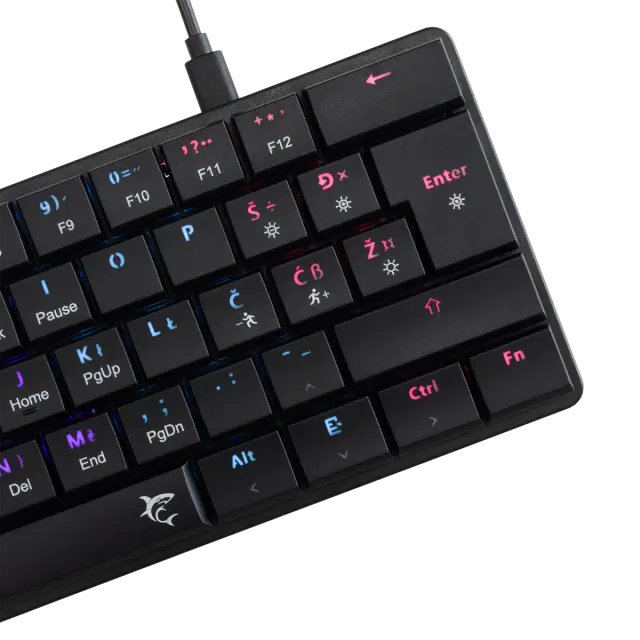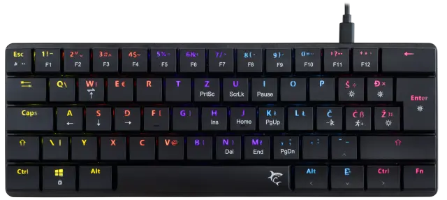 Število tipk: 61/62 Razporeditev tipk: Kompaktno Vrsta stikala: Mehansko rjavo z nizkim profilom Življenjska doba: Več kot 50 M pritiskov Anti-Ghosting: Popolna Anti-Ghosting Osvetlitev ozadja: Mavrični učinek / 19 različnih učinkov Barva: Črna Material: ABS plastika Vmesnik: Tip C - USB 2.0 (snemljiv) Dodatne noge za dvig tipkovnice: Da Dolžina kabla (m): 1,5 Pleten kabel: Ni na voljo postavitve: HR Mere (mm): 292x103x25 Teža (g): 320