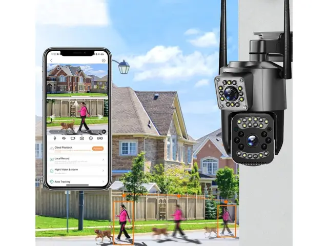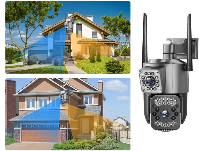 Kamera ima dva 6MP objektiva – enega statičnega in enega vrtljivega, kar omogoča hkratno spremljanje fiksne točke in širokega območja znotraj 355° vrtenja. Visoka ločljivost zagotavlja podrobno in ostro sliko tako podnevi kot ponoči, zahvaljujoč podpori za 4G SIM kartico pa kamera deluje neodvisno od WiFi-ja – samo vstavite kartico z aktivnim internetom.