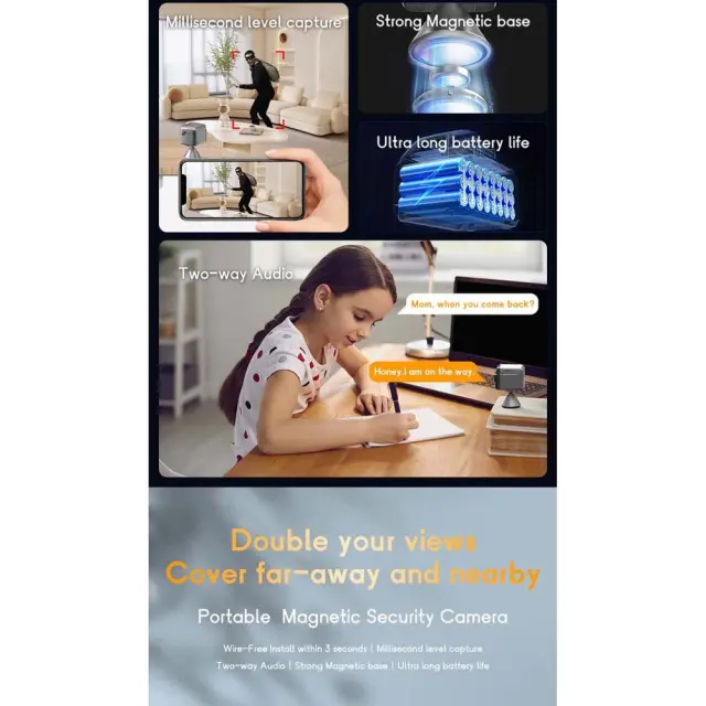 Izboljšane varnostne funkcije: Izboljšajte svojo varnost z naprednimi funkcijami te WiFi kamere z dvojnim objektivom. Opremljena z infrardečim nočnim vidom, snemanjem ob zaznavanju gibanja in dvosmernim zvokom, ta kamera zagotavlja celovite možnosti nadzora. Sistem z dvojnim objektivom ponuja širše vidno polje in izboljšano kakovost slike, kar zagotavlja, da zajamete vsako podrobnost. Snemanje ob zaznavanju gibanja sproži samodejno snemanje, ko je zaznano gibanje, kar prihrani prostor za shranjevanje in vas opozori na morebitne grožnje. Funkcija dvosmernega zvoka vam omogoča komunikacijo s komer koli v bližini kamere, kar odvrača vsiljivce ali omogoča interakcijo s hišnimi ljubljenčki. Združljiva s shranjevanjem v oblaku in podporo za pomnilniško kartico za prilagodljive možnosti shranjevanja.
