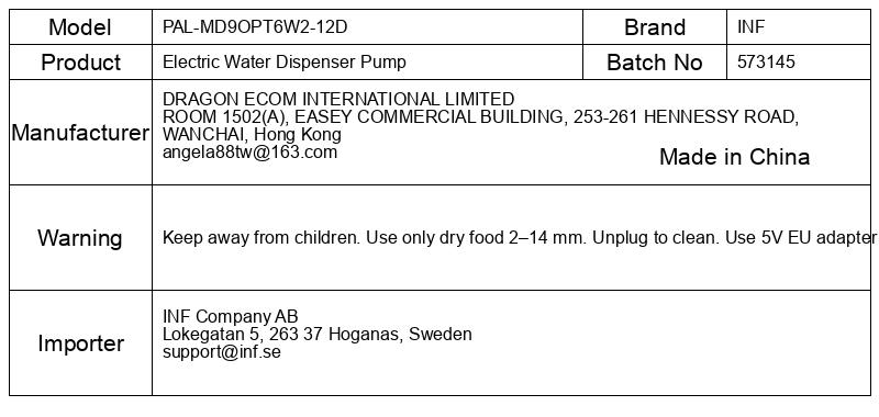 Parametri: Premer doziranja: 0–12 mm; Uporabni premer briketov: 2–14 mm; Dnevna nastavitev: 12 obrokov po 12 porcij; Velikost porcije: približno 9 g na porcijo; Prostornina: 6 l; Napajanje: 5 V napajalnik (vtič EU)/3 D baterije; Snemanje: Funkcija snemanja glasu; Pokrov: Vrtljiv pokrov; Vizualno: Vizualni predal za shranjevanje; Opomba: Izdelek ne vključuje baterij.