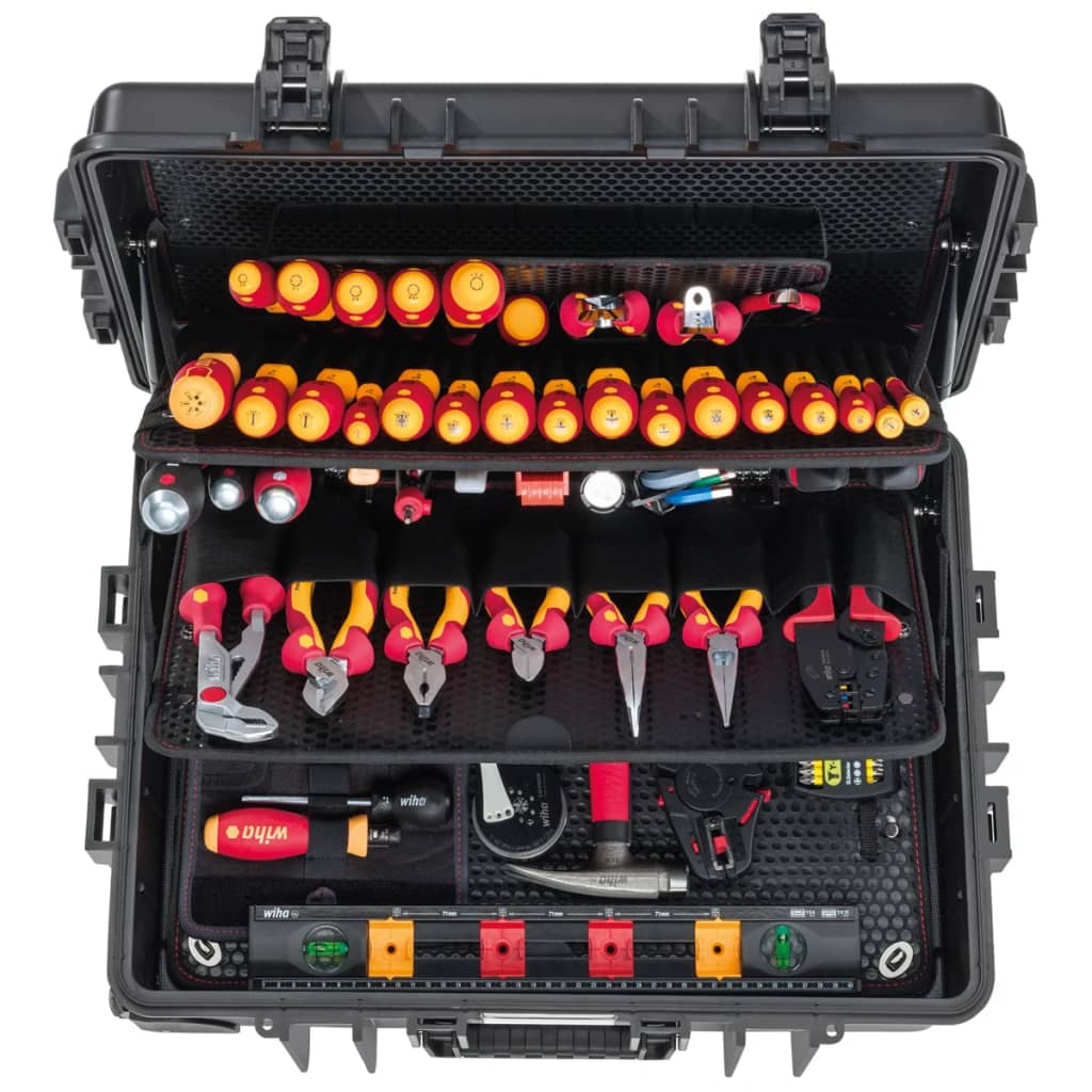 Ta kovček za električarje vsebuje 115 kosov preprosto dosegljivega orodja, ki vam bo v pomoč pri učinkovitem delu. Zahvaljujoč obširni opremi, bodo imeji električarji pravo napravo za vsako delo, kot so LiftUp električno držalo za nastavke, popolnoma izolirani izvijači Wiha Slim linje ali TriCut montažne klešče. Škatla za shranjevanje ima veliko prostora, vanjo pa se bo podala tudi vodna tehtnica, ki je posebej zasnovana za električarska opravila.