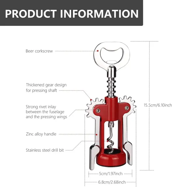 【HIGH QUALITY MATERIAL】 – This easy-to-clean corkscrew bottle opener and wine bottle opener is made of zinc alloy body and stainless steel bottle opener, which is high in strength, flexible and comfortable, and easy to hold.【Easy to Use】- The wing-shaped design of this bottle opener makes it easy to grab the spread wings when drilling and pull effectively while removing cork.【Great Value】 – The bottle opener adds extra value as it comes with a pleasing chrome bottle stopper. Use bottle stoppers to extend the life of your wine, lock in delicious flavors and prevent any unnecessary spills!【Multipurpose & Gift Giving】 - Perfect for any restaurant, bar or home for a romantic evening or casual drinks. Buy a sturdy heavy duty and durable wine bottle opener as a great gift for your family or good friends.