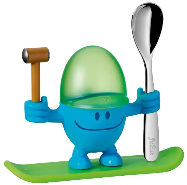 WMF jajčna skodelica McEgg z ujemajočo se žlico za otroke od 3. leta. McEgg je ime živahne skodelice za kuhano jajce, ki jo servirate kar na jedilno mizo. Preprosto uporabite vrtljivo kladivo, da počite lupino in zberete jajčne lupine v pokrov.